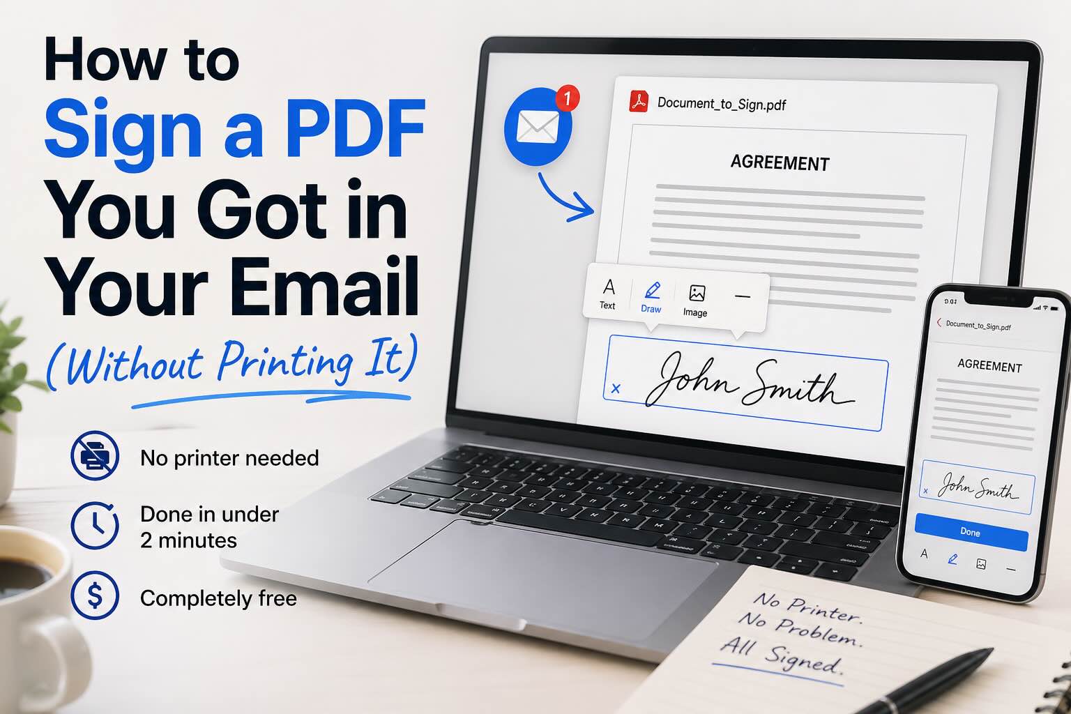 Someone emailed you a PDF to sign and you don't have a printer. Here's how to sign it in under two minutes on any device, completely free.
